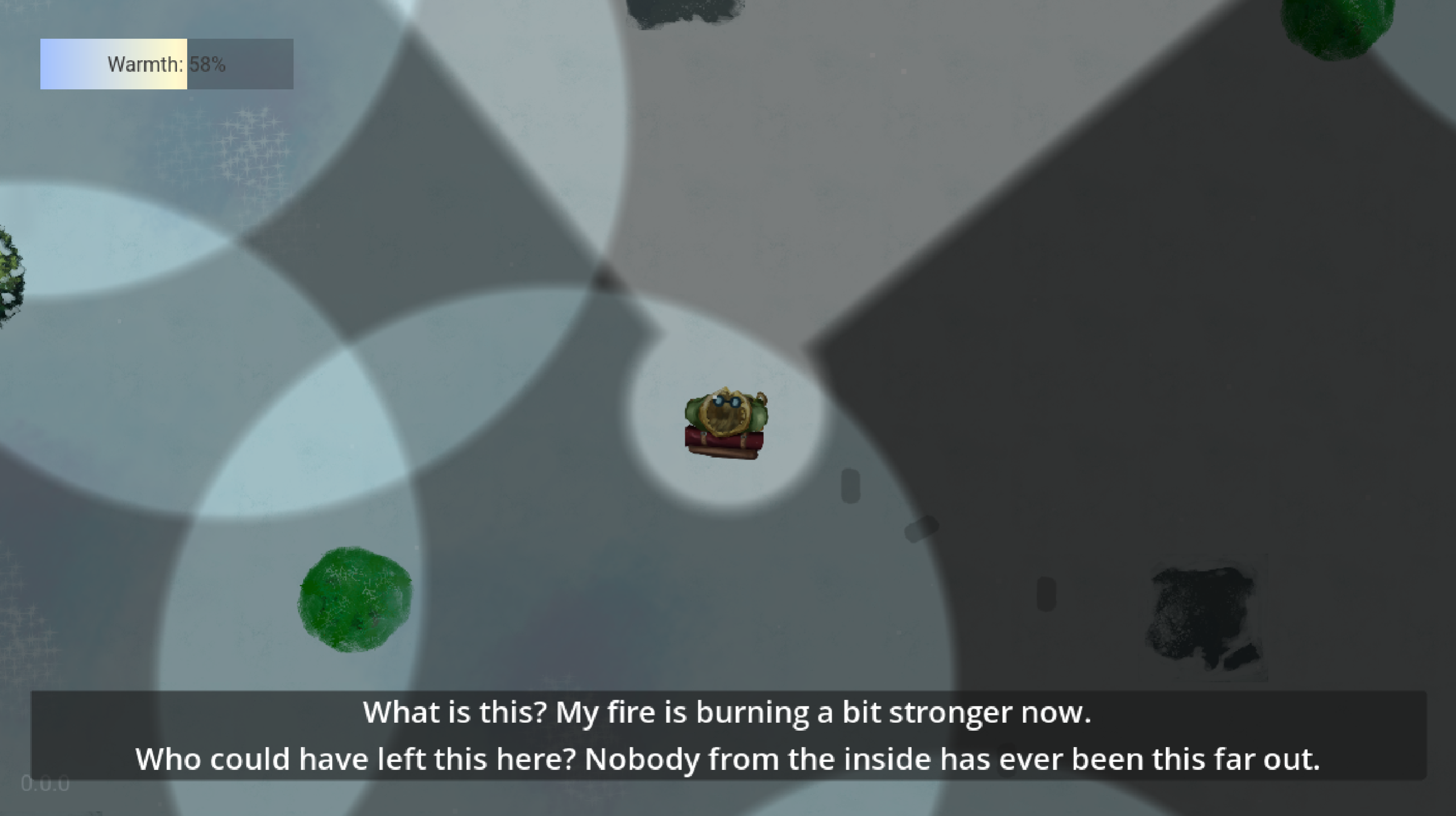 Genre: Survival, adventure, Tone: Lonely, cold, Description: A narrative-driven 2D top-down game with warmth as a survival metric. The player finds voiced-over story fragments throughout the adventure as they attempt to find safety.