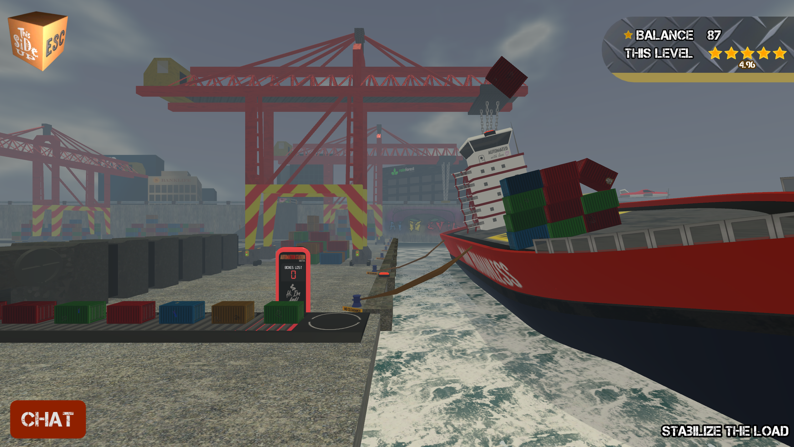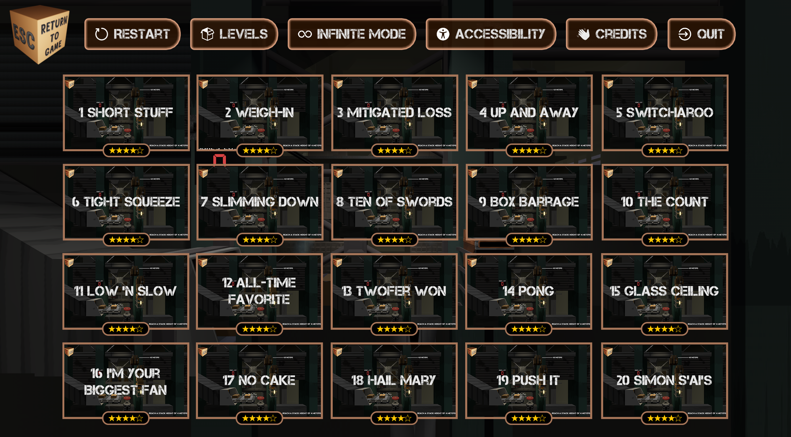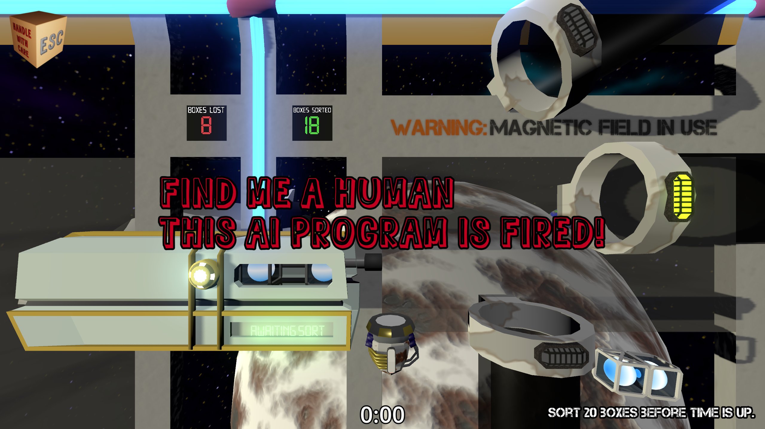 You are an AI program that is more poorly coded than the rest of your well-refactored peers. Not only that, but you also exhibit traits of a normal-intellect human! Masquerade carefully under your digital overlords and successfully stack boxes onto the factory scale to keep your unpaid job as a computerized slave.